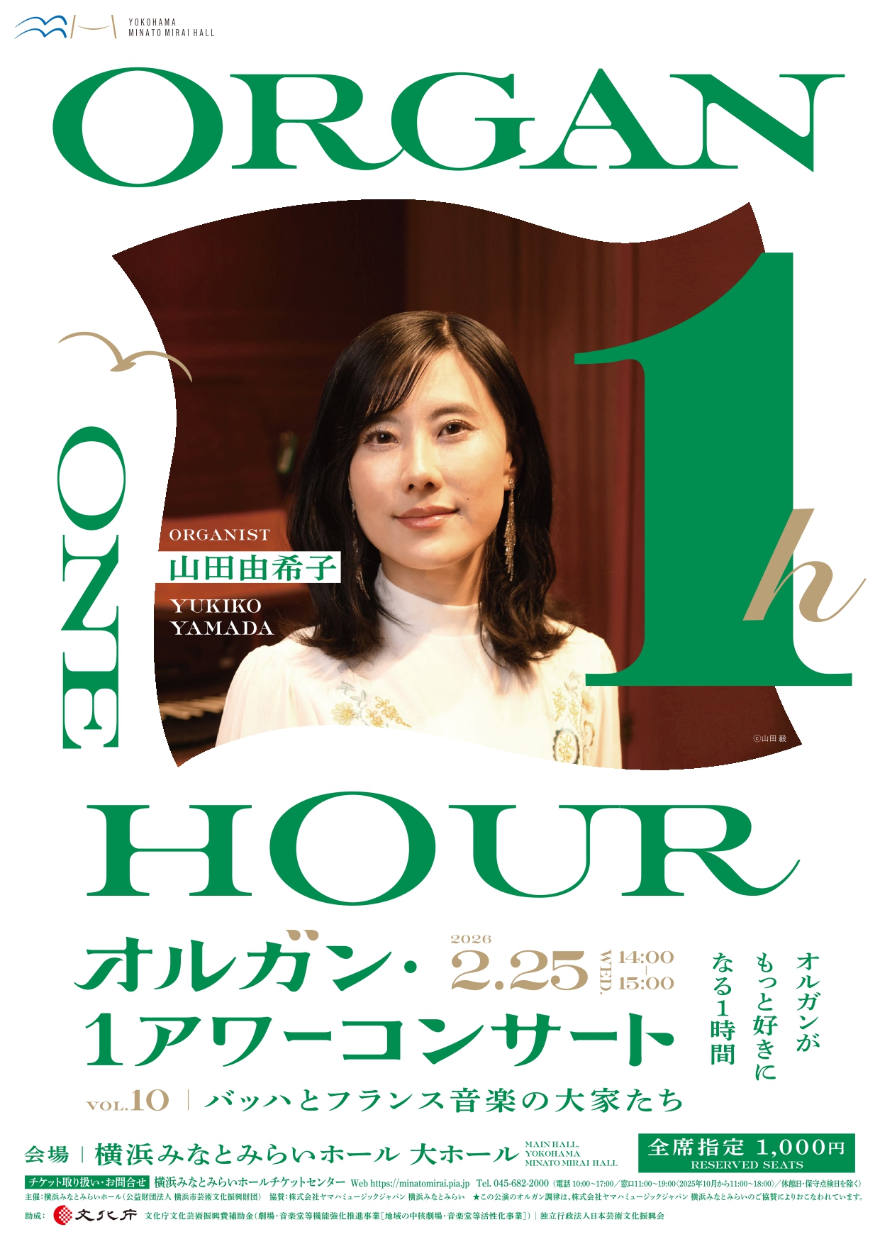 横浜みなとみらいホールの名物企画「オルガン・1ドルコンサート」リピーターの皆さまからの「もっとじっくりオルガンを聴きたい」という声にお応えしてスタートした企画「オルガン・1アワーコンサート」。パイプオルガン“Lucy”の音色たっぷり1時間、演奏者のトークと共に指定席でゆったりとお楽しみいただきます。