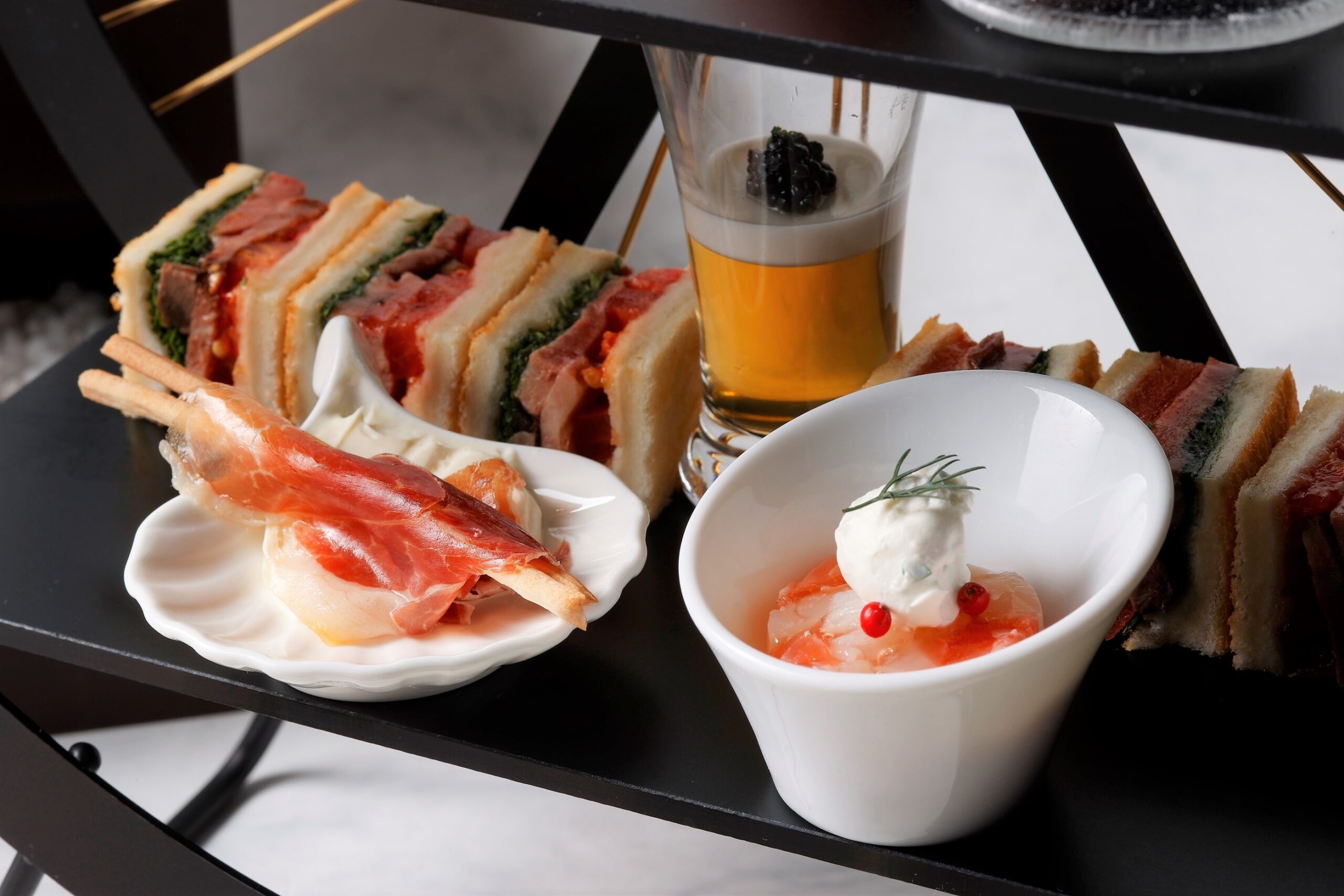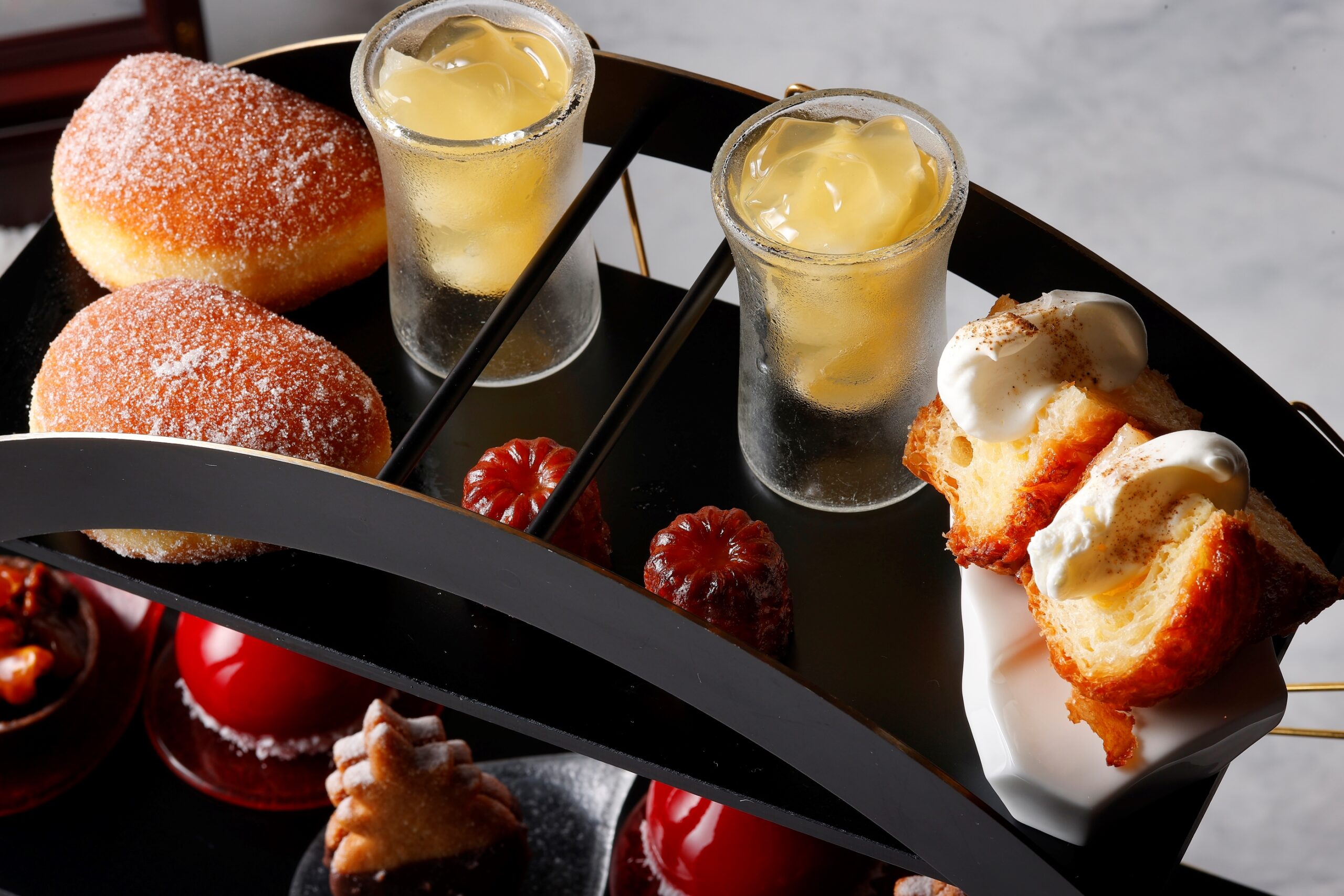/ カヌレ・ド・ボルドー / クイニーアマン 大塚スタイル (中段)タルト カラメル ノワ / ルージュ / サブレ・ザ・カハラ (下段)コンソメジュレとカリフラワーのヴルーテ キャヴィアリ キャビアとフレーバーオイル / スコットランド産アトランティックサーモンとホタテのタルタルソースエイグレット / 生ハムグリッシーニとクリームチーズのムース / 独自の調理法で加工した松阪牛フィレのインダイレクトロティ“シグネチャーサンド”